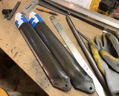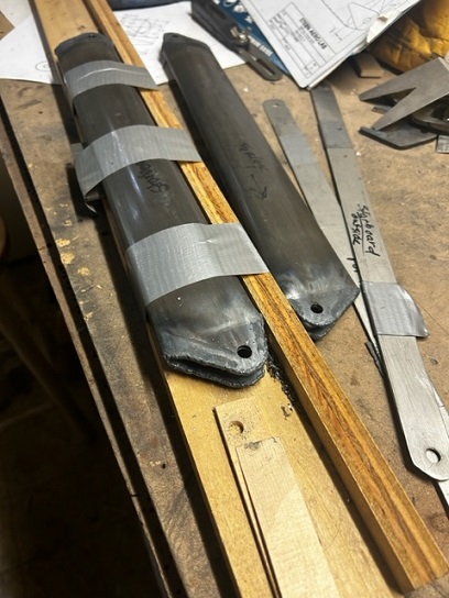 Back down to the basement workshop to profile both ends of each of the remaining cabane tubes. SQUEEZE per the plans. Bend trim and fit inserts. Then... drill all four holes.