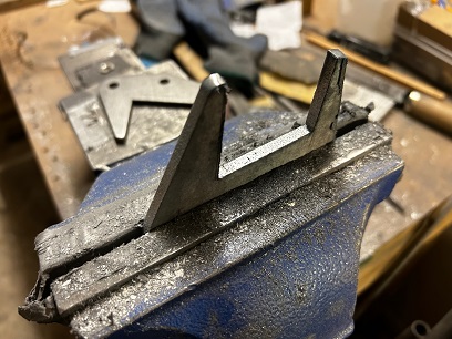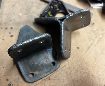 And back to cutting, grinding, sanding, banging out new pieces for these two brackets. After going through all the gyrations again for the third time, I did a dry run before welding up the brackets and they looked great. Back to the workshop to weld them up then drill the holes. Wasn't happy with how I drilled the holes on the last set (basically fumbling through it) so I sat back and thought it through. Ended up bolting my double-slide vice to the drill press and made these holes SPOT ON. VERY HAPPY with the final product.